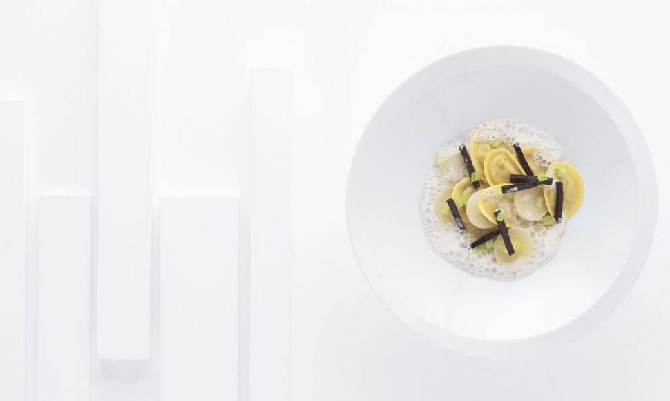 Ravioli de foie gras au tapioca, émulsion de topinambours, une râpée de truffe noire