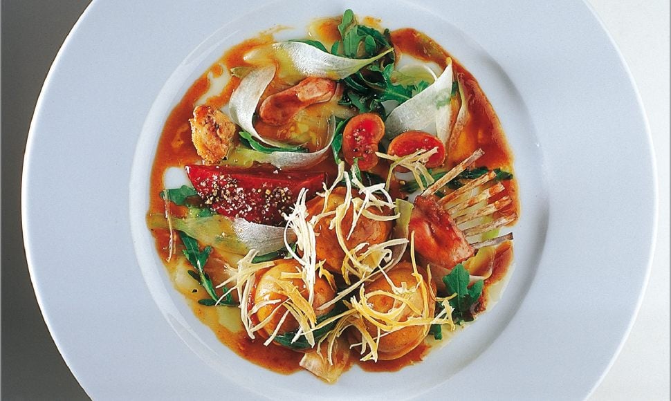 Ravioli de lapin d’herbes et de salades amères, le foie confit rosé, le carré rôti moelleux