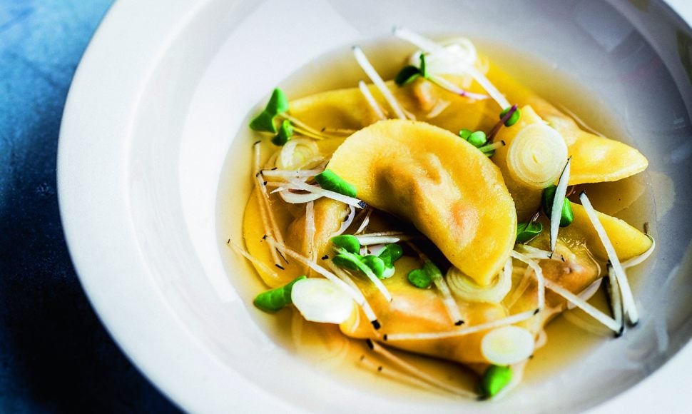 Pendant la cuisson du bouillon, étalez finement la pâte. Avec un verre, découpez des disques. Garnissez-les d’un cube de foie gras, appliquez un peu d’eau sur la moitié du bord interne et pliez en deux pour former une demi-lune.