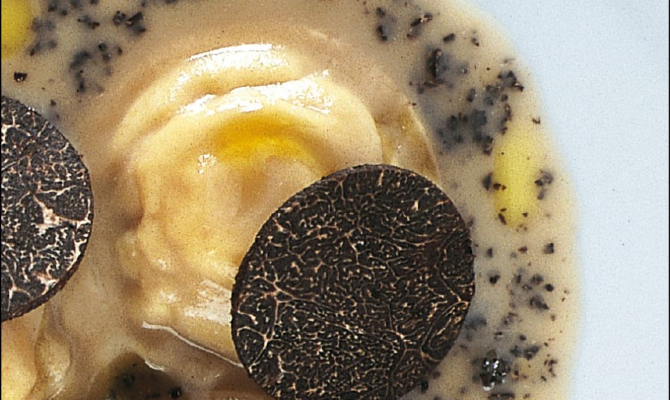 Ravioli de potiron cuits dans un bouillon de poule corsé, truffes noires et œufs de caille mollets