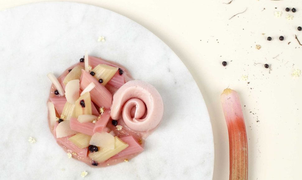 De la rhubarbe pochée au sureau et à la framboise, accompagnée d'un sorbet rhubarbe et d'une gelée infusée.