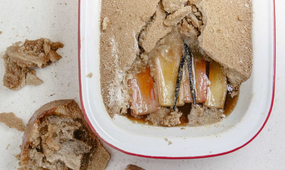 Chauffez le four à 180 °C (th. 6). Épluchez et rincez les tiges de rhubarbe.