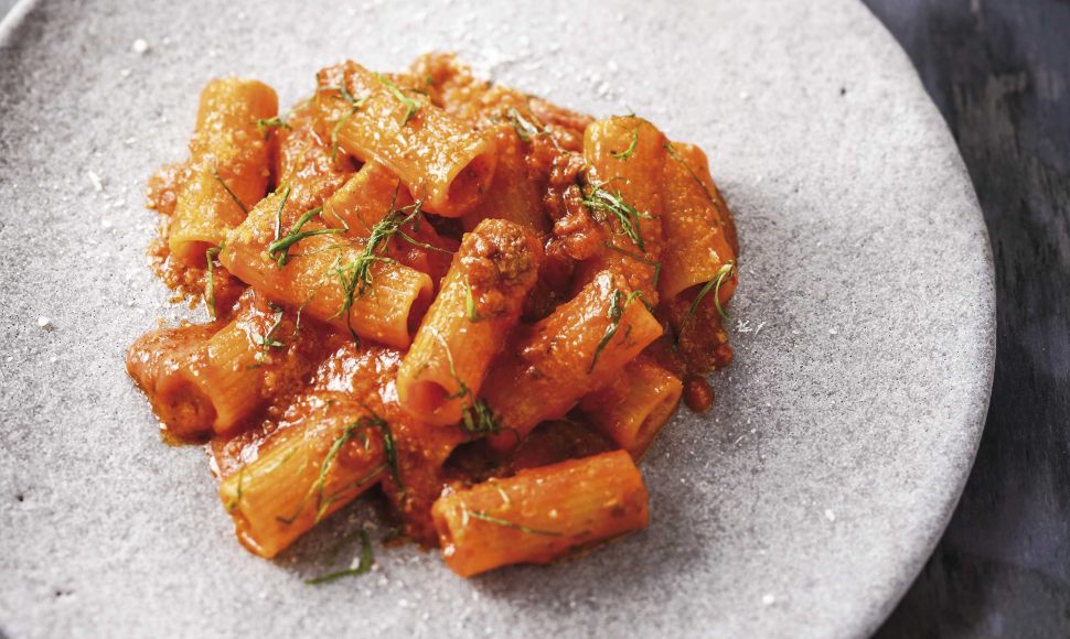 Des rigatoni à la bolognaise au vin rouge à base de bœuf et porc hachée carotte, oignon, céleri.