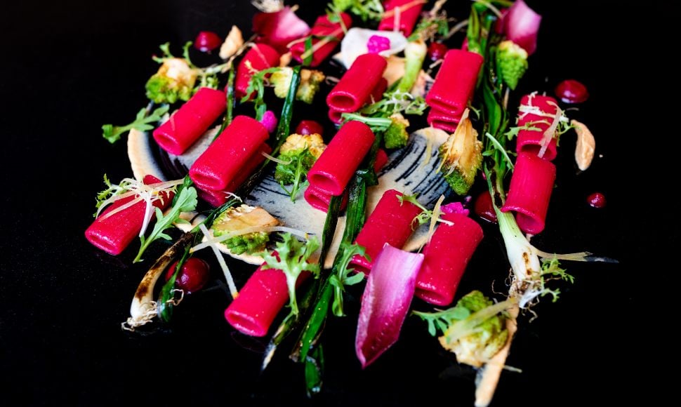 Dressez les rigatoni dans des assiettes selon une ligne directrice. Ajoutez les poireaux, les fleurs de brocoli, la betterave chioggia taillée en julienne, la frisée et les feuilles d’endive. Arrosez d’un peu d’huile d’olive. Parsemez de basilic frais et de quelques grains de fleur de sel. Poivrez.