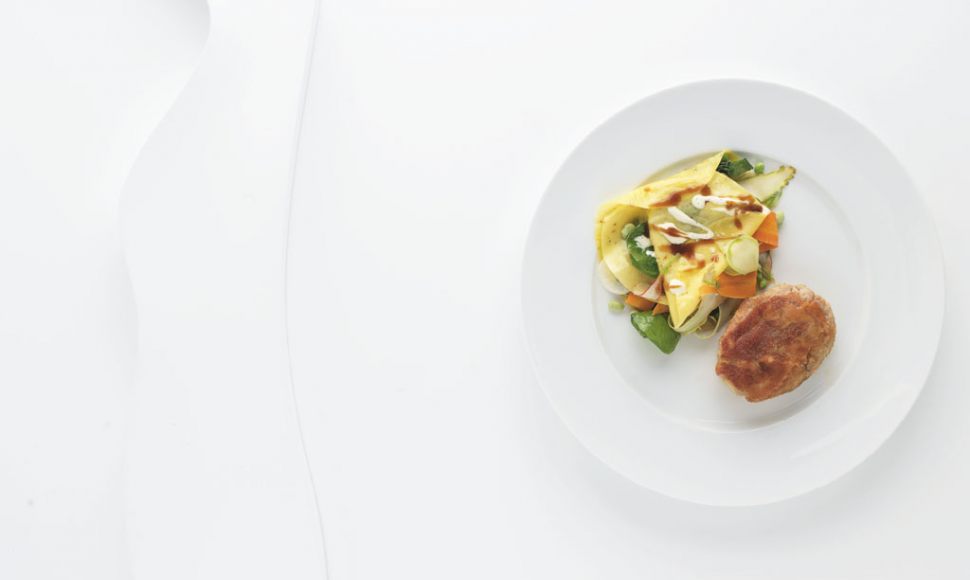 Ris de veau de lait finement pané, lasagnes safranées et primeurs, des pousses d’épinards