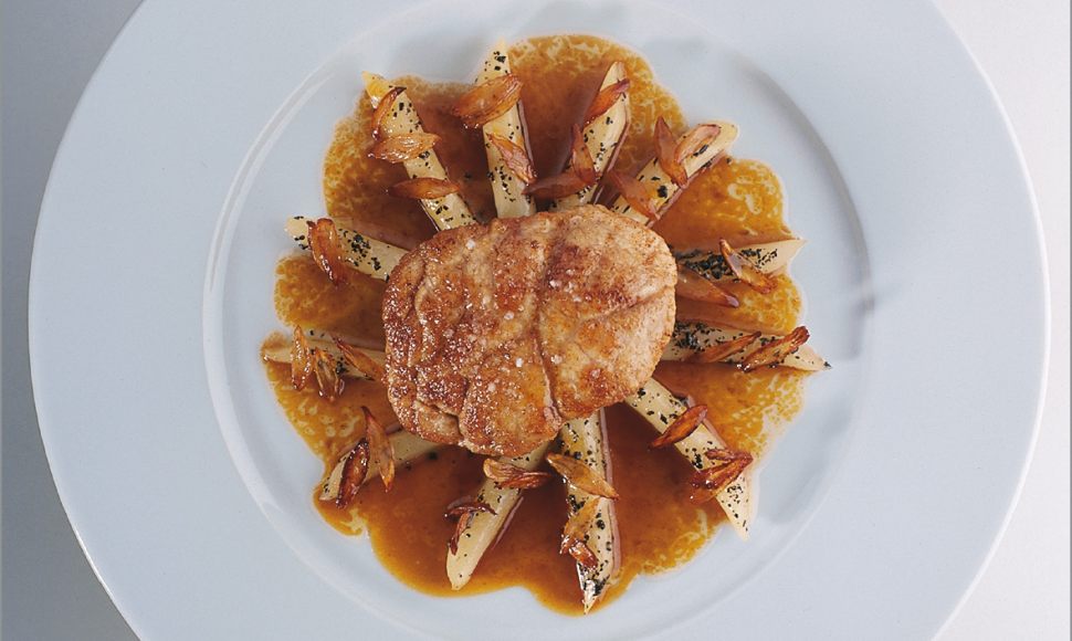 Ris de veau doré au beurre demi-sel, des salsifis étuvés, d’autres caramélisés, vrai jus