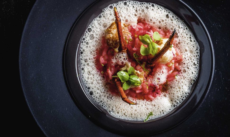 Un risotto à la bisque de carapaces de crustacés au vin blanc, mini-basilic et citron vert.
