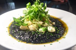 Au bout de 17 minutes ajoutez l’encre de seiche, mélangez bien puis mettez le beurre et la parmesan râpé. Liez en remuant avec une spatule.