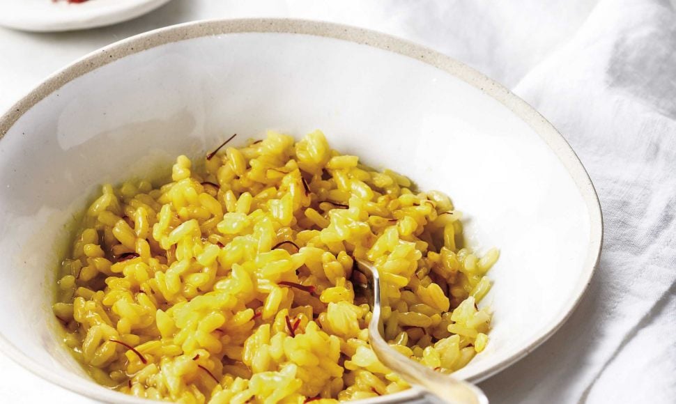 Un risotto cuit au bouillon de légumes au parmesan et saupoudré de pistils de safran.