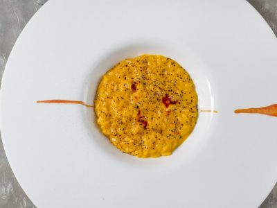 Le plat choisi par le Chef pour Taste est un de ses plats signature. Il a créé cette recette en hommage à sa femme Mariapia, et en l’honneur de la Calabre, région dont elle est originaire. La réglisse et le safran sont deux produits représentatifs du sud de l’Italie. Une jolie symbolique est attachée à l’histoire de ce plat, car avec ces deux ingrédients, Massimiliano a voulu recréer une fleur : la réglisse en guise de tige, et le safran - précieuse épice, en guise de pétales. Ce plat est d’ailleurs en permanence à la carte du restaurant 3 étoiles La Calandre, où le chef officie, dans la région de Padoue. “Buon Appetito !”