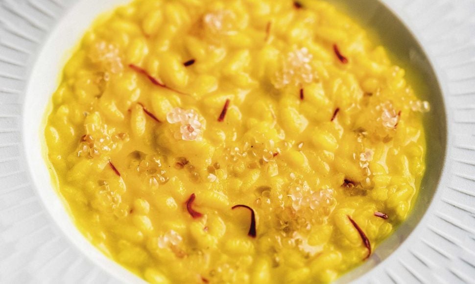 Un risotto aux légumes aromatisé au safran et au citron caviar et Grana Padano.