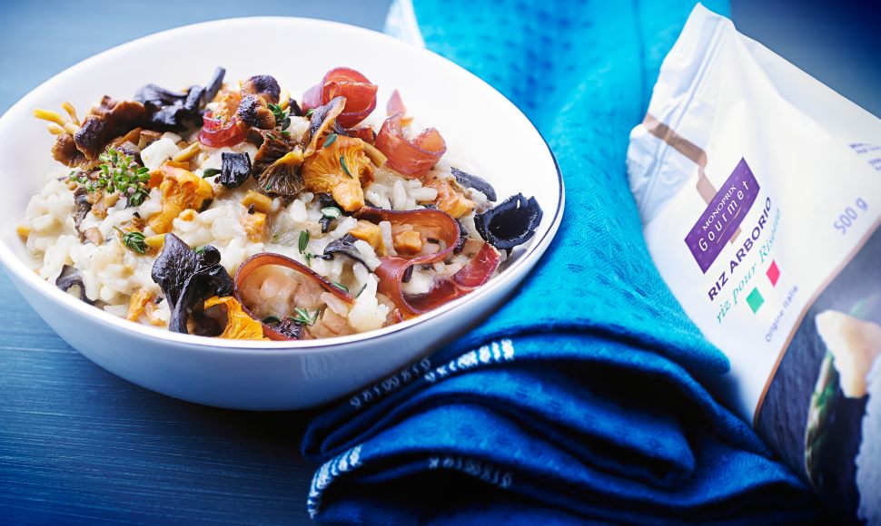Laver les champignons et les couper en morceaux. Faire chauffer une poêle avec un filet d’huile d’olive et cuire les champignons avec une gousse d’ail écrasée et le thym.Couper la mozzarella en cubes et la viande de grison en lanières. Ciseler l’oignon et le faire suer dans une casserole avec un peu d’huile d’olive. Ajouter le riz avec un peu d’huile et un verre de Crémant de Loire. Laisser s’évaporer complètement et répéter l’opération 2 fois.