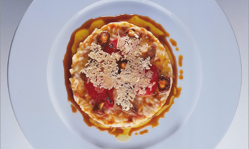 Risotto aux tomates confites à l’huile d’olives très mûres, poêlée de girolles