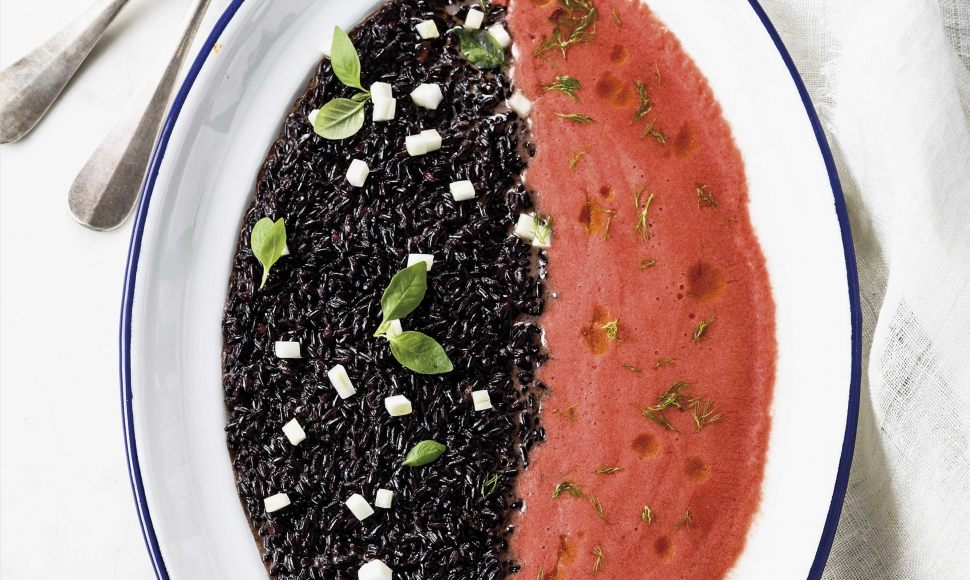Un risotto chaud/froid bicolore au riz venere et tomates cerise, fenouil au parmesan.