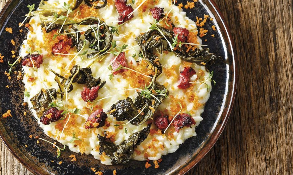 Un risotto à la chicorée et au tastasal (chair de saucisse salée) saupoudré de parmesan et de pousses d'alfalfa.