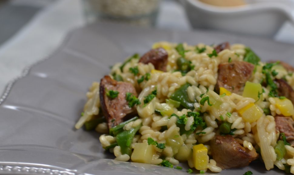 Versez le riz, mélangez sur feu modéré jusqu’ à ce que le riz devienne translucide (environ 1 à 2 mn). Mouillez avec le vin blanc et laisser s’évaporer. Commencer à verser louche par louche le bouillon pendant 14 mn puis ajoutez les légumes l’agneau puis continuer la cuisson 4 mn (Vérifier la cuisson al dente !! si nécessaire ajouter encore une petite louche de bouillon)