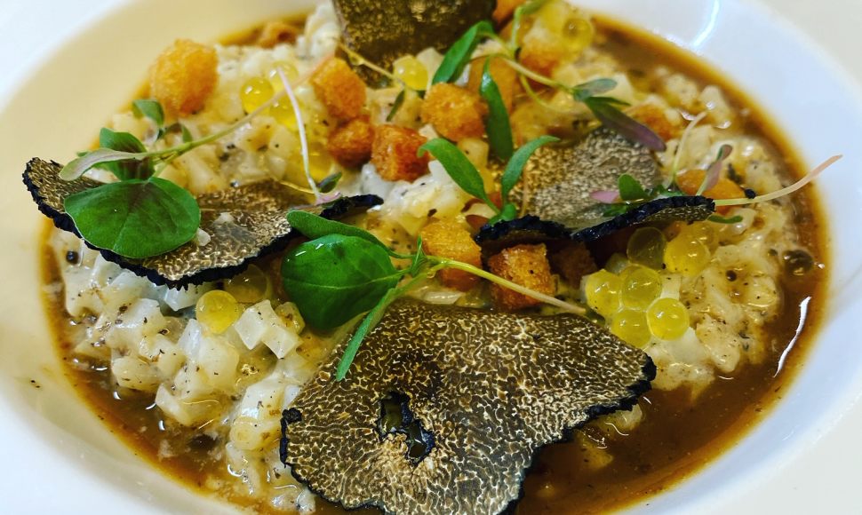 Quand le bouillon est presque tout absorbé, ajouter le mascarpone et le parmesan. Mélanger à l’aide d’une spatule puis râper la moitié de la truffe. Vérifier l’assaisonnement . Mettre dans une assiette creuse, disposer les croutons les billes de citron et des copeaux de la truffe restante