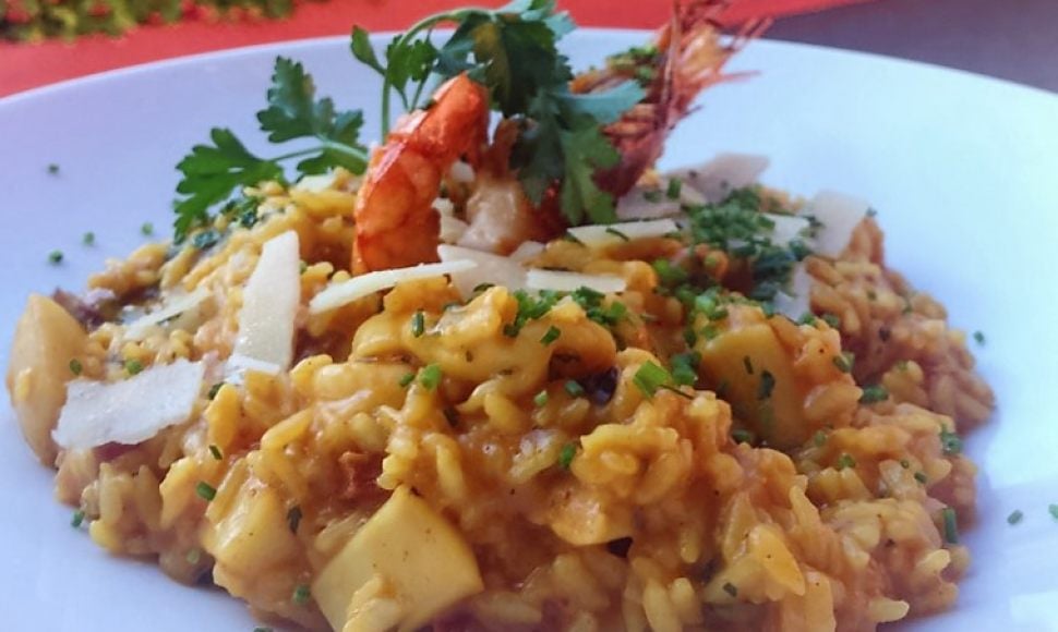 Verser le riz, mélanger sur feu modéré jusqu’à ce que le riz devienne translucide (environ 1 à 2 minutes). Mouiller avec le vin blanc et laisser s’évaporer tout en remuant. Commencez à verser louche par louche le bouillon pendant 14 minutes, ajouter les fruits de mer, le chorizo et les gambas tigers et laisser au risotto 3 minutes de cuisson.