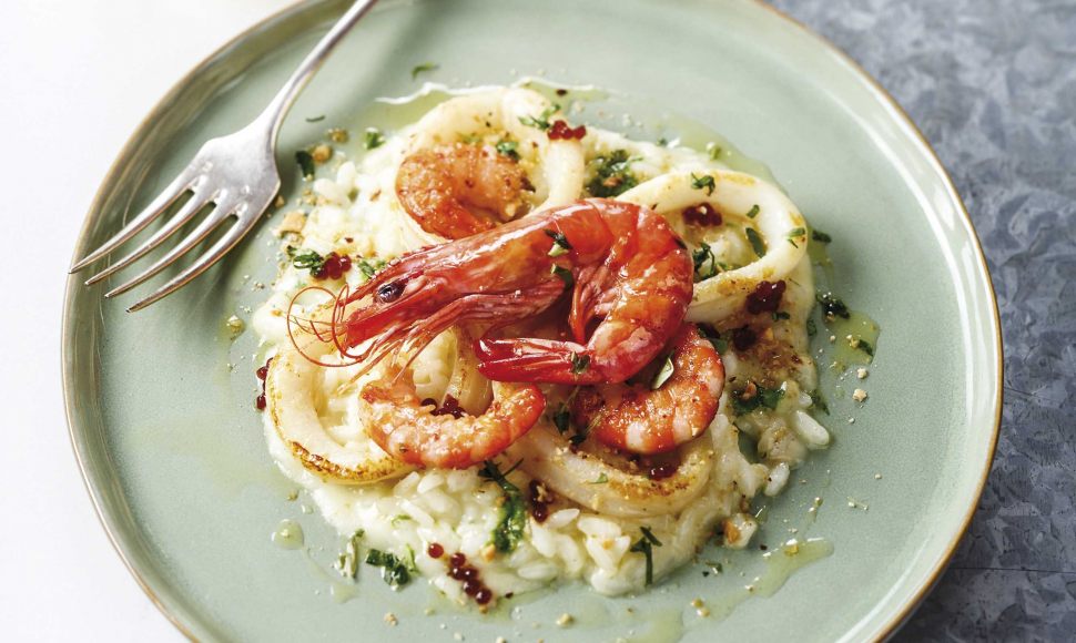 Un risotto préparé dans un bouillon de légumes et un fumet de poisson aux calamars, crevettes et œufs de truite parsemé de persil haché.
