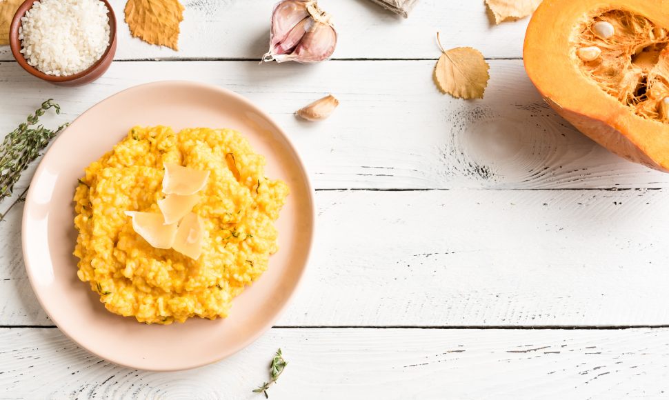 Une risotto de millet, potiron au gingembre râpé et d'un verre de lait de coco.