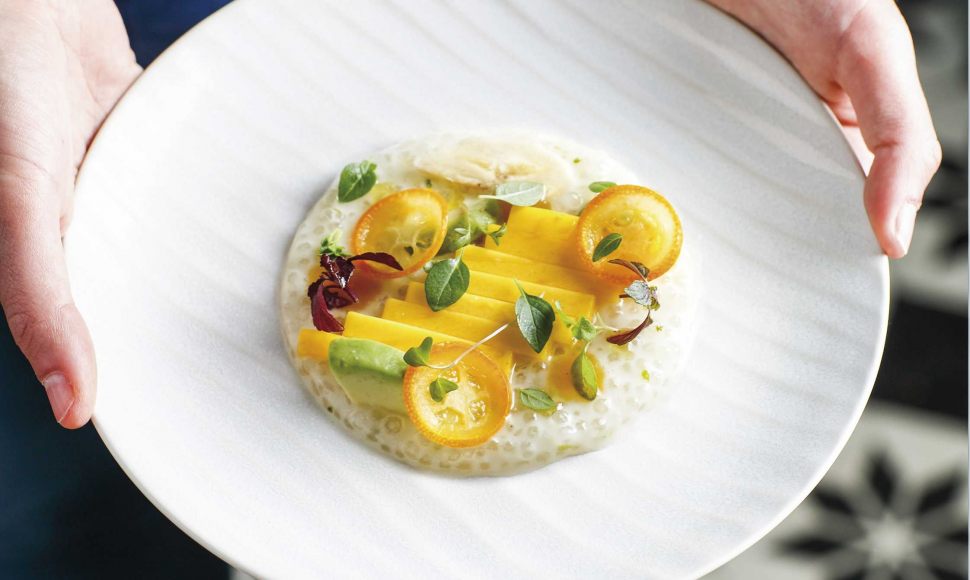 Un risotto à base de tapioca aux fruits exotiques : citron vert, mangue, kumquats, banane, avocat.