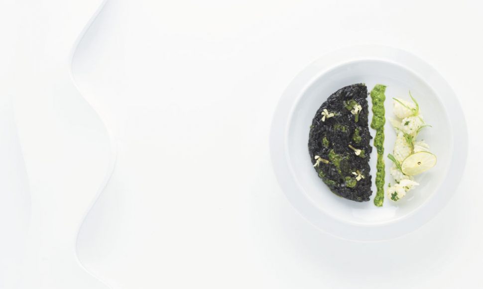 Risotto mantecato à l’encre de seiche et pistou, calamars à la plancha, huile d’olive et persil