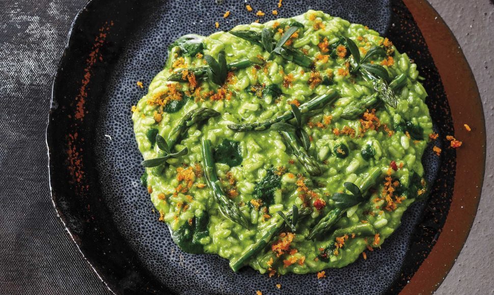Un risotto vert cuit dans un bouillon de volaille aux asperges vertes et parmesan.