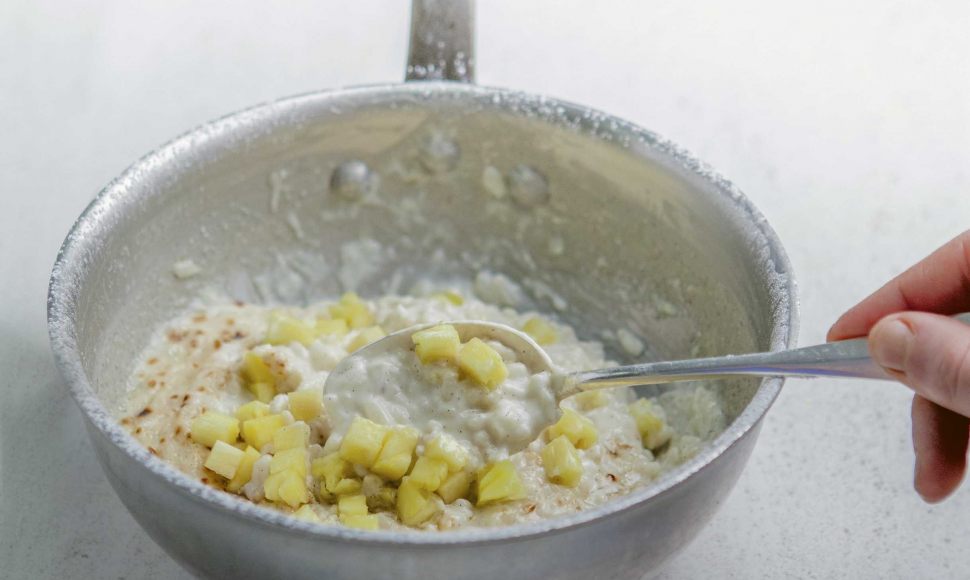 Coupez le feu et ajoutez le lait de coco. Mélangez bien et laissez refroidir dans la casserole.