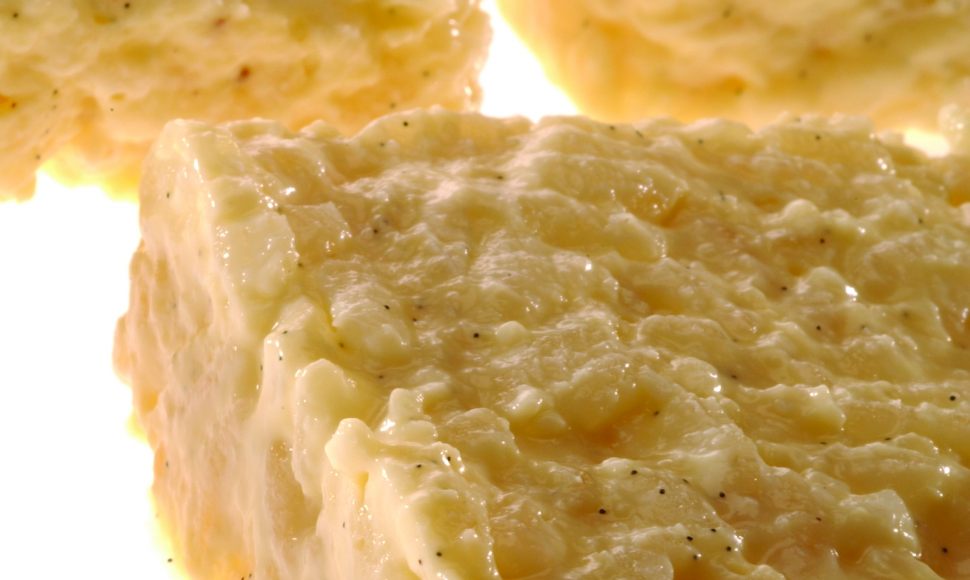 Verser le lait dans une casserole. Fendre la gousse de vanille en deux, gratter la pulpe au-dessus du lait, ajouter la gousse. Porter à ébullition. Retirer du feu.