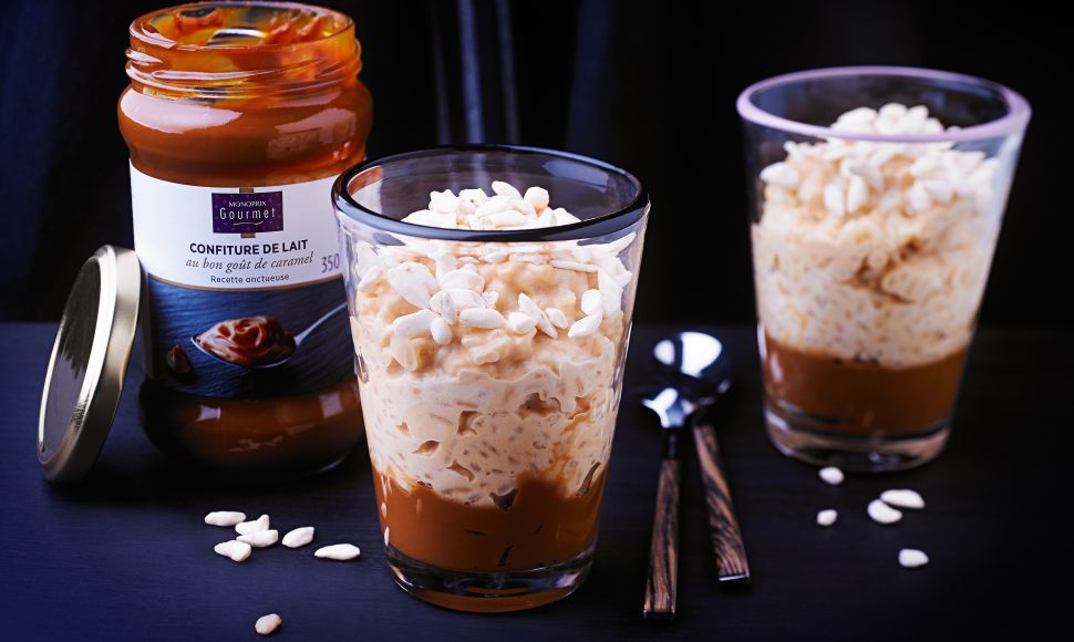 Dans de l’eau froide, mettre le riz et arrêter la cuisson dès que l’eau bout. Égoutter le riz et le faire cuire avec le lait. En fin de cuisson, incorporer la confiture de lait.