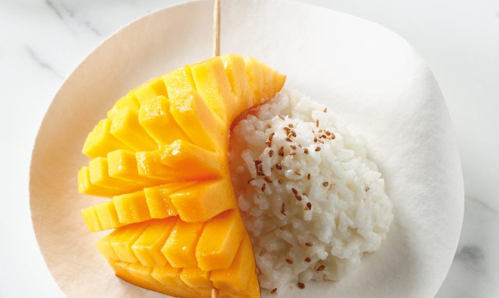 La Thaïlande (et l’Asie en général) n’est pas une grande pourvoyeuse de desserts. C’est sans doute ce qui permet aux asiatiques de garder la ligne tout en mangeant à toute heure de la journée et copieusement. J’ai quand même conservé un souvenir émouvant de ce dessert traditionnel, rencontre improbable du riz, du lait de coco, du sel et de la mangue. Toujours en quête de raccourcis, j’ai utilisé du riz déjà cuit et remplacé le lait de coco et le sucre par un sorbet à la noix de coco qui s’éternisait dans mon congélateur. Le résultat était plus qu’à la hauteur de mon souvenir. Cela dit, si vous avez la chance d’aller faire un tour dans une épicerie asiatique, achetez du sucre de palme. Il se présente en cylindre et il vous faudra le râper pour l’ajouter à vos desserts. Je suis complètement dingue de son arôme, au point de ne plus pouvoir sucrer mes yaourts avec autre chose.