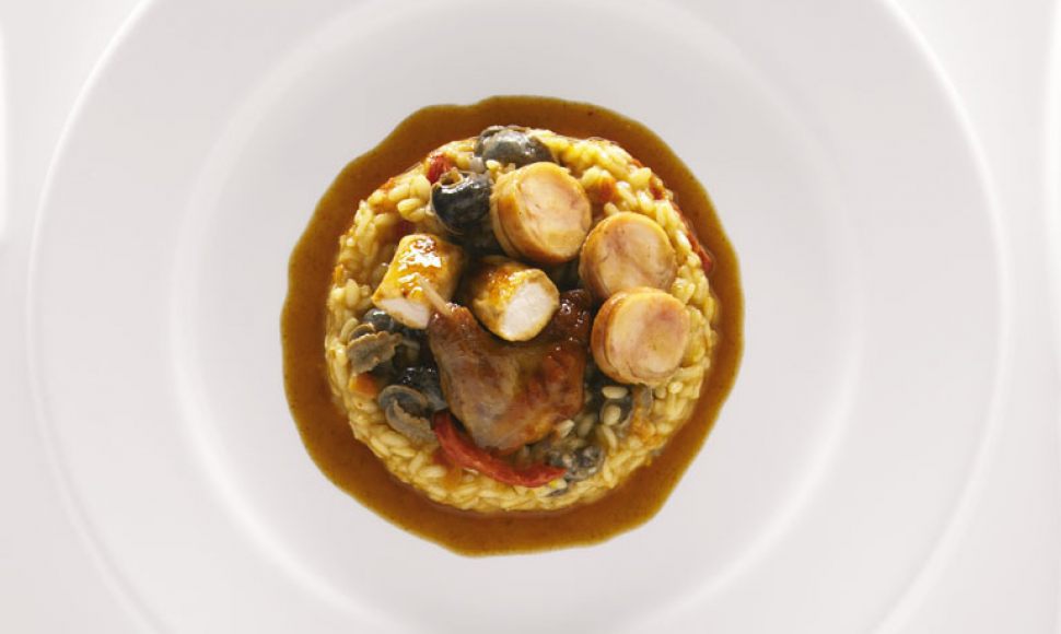« Arroz con conejo y caracoles » est une version minimaliste de paella, propre à la région sèche, où lapin, escargots puis riz sont cuits ensemble à l’eau. Nous avons gardé les ingrédients de la recette originelle en les traitant autrement.