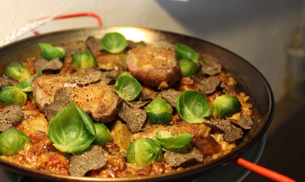 Dans un plat à paella, colorer les ailerons, la cuisse et le manchon du pigeon ramier ainsi que la poitrine juste côté peau. Une fois bien croustillant retirer la poitrine et la garder pour la fin de la cuisson. Ajouter les artichauts, la sobrassada, le boudin coupé en cubes et le riz. Bien nacrer en mélangeant sans cesse. Incorporer le safran et le piment d’Espelette. Mouiller avec le fond blanc chaud et poursuivre la cuisson au four à 180°C pendant 15 minutes. A ce moment-là, ajouter les choux de Bruxelles cuits ainsi que la poitrine de pigeon côté chair en contact avec le riz.