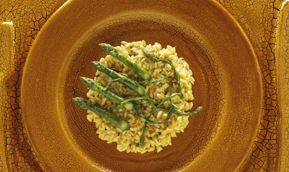 Par sa richesse particulière en amidon, le riz Carnaroli a un grain consistant et une bonne capacité d’absorption. C’est pourquoi nous l’utilisons de préférence. Ici, dans ce qui pourrait être une paella d’asperges, son moelleux se mêle à la douceur du légume tandis que les pignons apportent une note croquante.