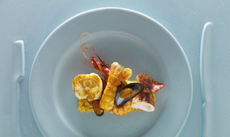 Ce plat serait né dans une guinguette sur le plage de Calpe, au pied du majestueux peñón de Ifac. Un petit maître voulait manger « un riz à se lécher les doigts » mais sans se lécher les doigts : sans avoir à faire l’effort d’éplucher les gambas et les langoustines. Et le cuisinier lui a donc servi le plat tout prêt. Ainsi, le riz du petit maître est une paella de crustacés sans coquilles ni arêtes ni carapaces. Nous en avons gardé tous les ingrédients et cuits le riz comme un risotto.