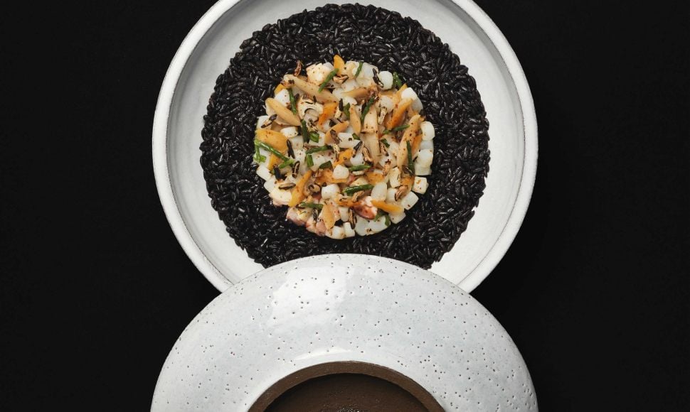 Corsé, moelleux et croustillant à la fois, le riz noir nerone est cuit au four dans un bouillon de coquillages au vin rouge, façon cacciucco.