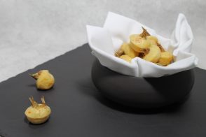 « Arros a banda » (« riz à part ») est un plat de pêcheur, de bateau, préparé dans un chaudron, l’emploi de la paella étant impossible à bord. C’est un riz cuit dans un bouillon de poisson, généralement servi avec de l’aïoli mais dont il existe différentes variantes avec ou sans poissons et crustacés. Voici notre interprétation.