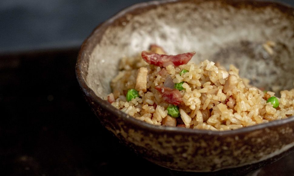 Lorsque toute l’eau est absorbée par le riz, baissez le feu au minimum. À l’aide de baguettes, retournez le riz très délicatement pour ne pas casser les grains et aérez-le.