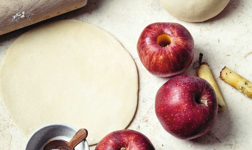 Posez une pomme sur chaque grand cercle, recouvrez d’un petit et fixez bien le tout. Dorez au jaune d’œuf.