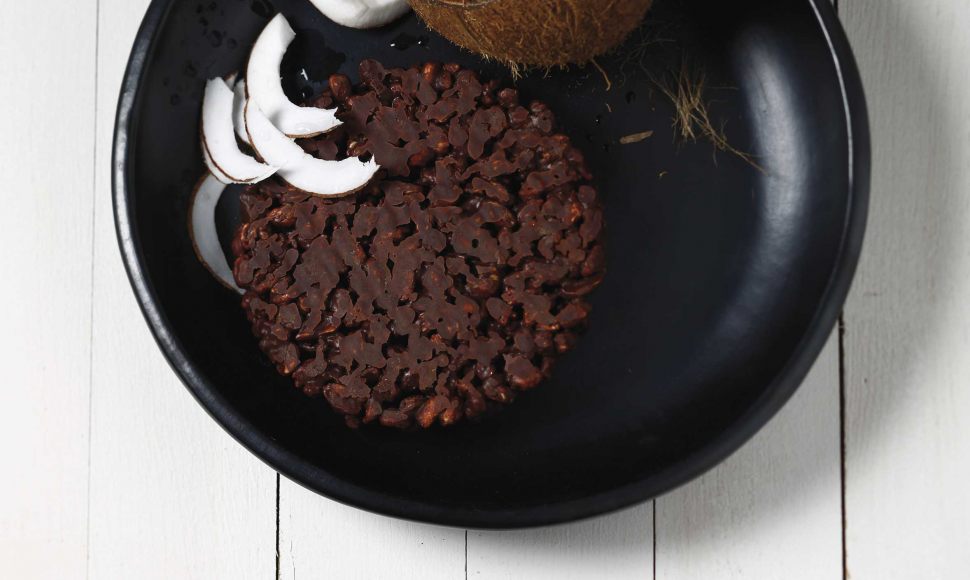 Un rocher chocolat noir-amande-noix de pécan, accompagné de copeaux et crème de noix de coco.