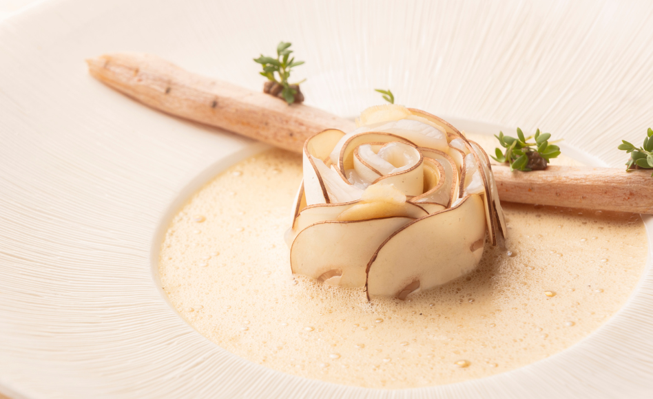 Ici, les noix de Saint-Jacques se déploient en carpaccio délicat, accompagnées d’une purée veloutée de champignons de Paris et relevées d’une émulsion subtile — une composition raffinée qui marie élégance marine et saveurs boisées.
