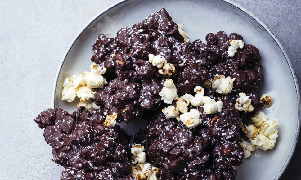 Dans une casserole au bain-marie, faites fondre le chocolat avec le beurre jusqu’à l’obtention d’une préparation liquide. Ajoutez-y les corn flakes et le pop-corn sucré. Mélangez le tout avec la fleur de sel et déposez des petits tas de 70 g un peu aplatis sur 1,5 cm d’épaisseur sur une plaque recouverte de papier cuisson.