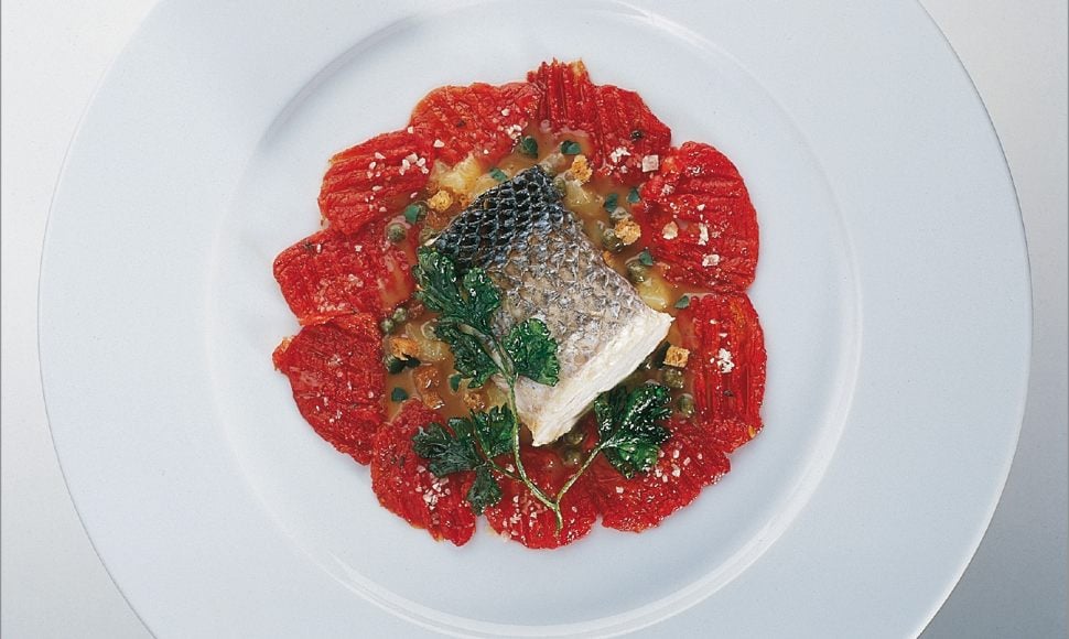 Rôti de loup de méditerranée, tomate confite écrasée, une grenobloise classique
