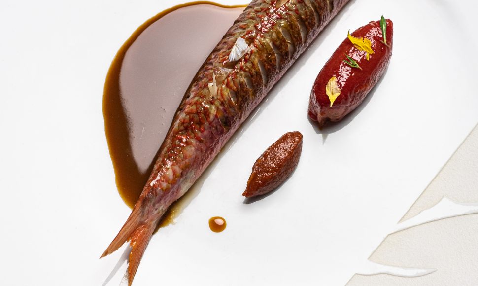 Rouget de roche agrafé, tomates poupées russes, pulpe enrichie de jus de rouget