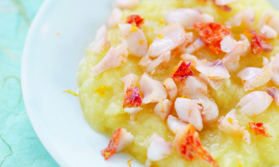 Lavez 1/2 fenouil(150 g environ) et 1 petite pomme de terre de 50 g. Coupez-les en petits morceaux. Lavez 1 orange non traitée. Avec un couteau économe, prélevez 1 zeste. Pressez le jus de la moitié du fruit et réservez-le dans un verre. Faites cuire les deux légumes à la vapeur avec le zeste d’orange pendant 15 à 20 minutes, jusqu’à ce qu’ils soient très fondants.