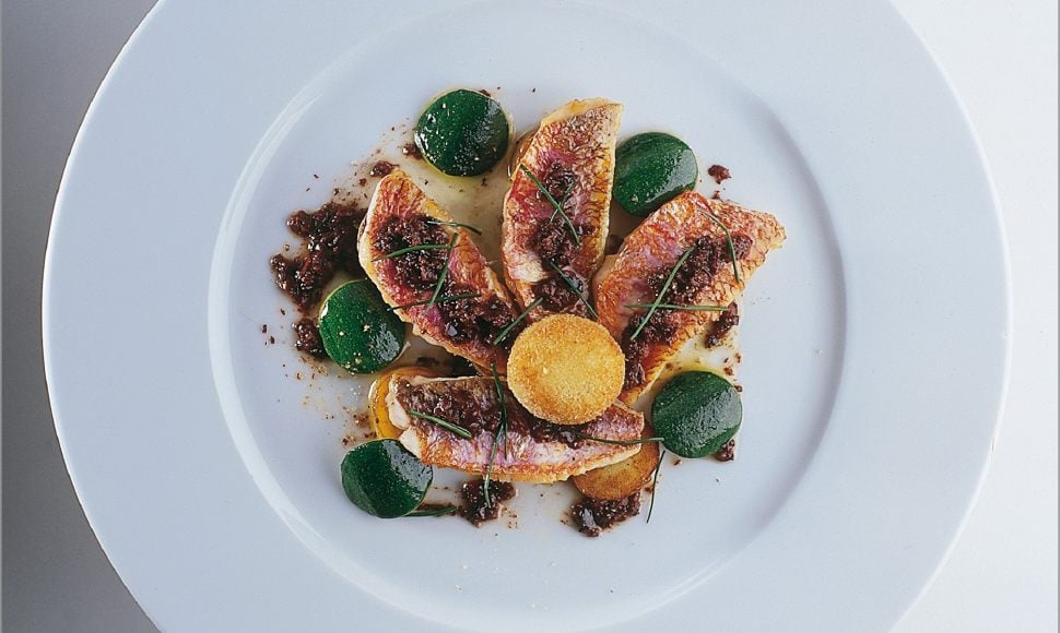 Rougets de roche du pays en filets poêlés, un sauté de pommes de terre nouvelles et courgettes à la tapenade