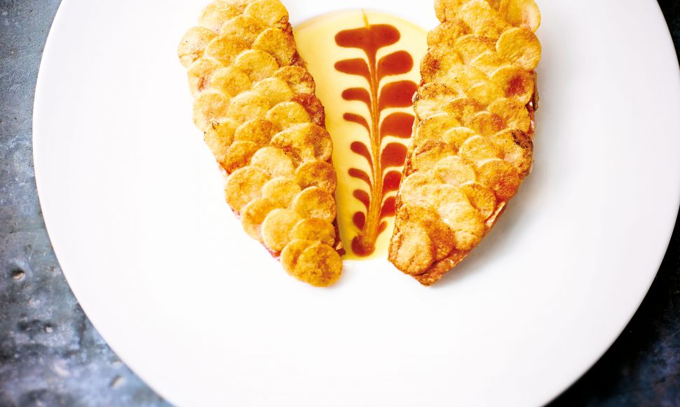 Mieux vaut utiliser du beurre clarifié pour les écailles de pomme de terre car il résiste mieux à la cuisson. Il est nécessaire de laisser reposer les filets au réfrigérateur : le beurre, en se figeant, fait office de colle. Pendant ce temps, commencez la préparation de la sauce qui demande deux réductions successives.