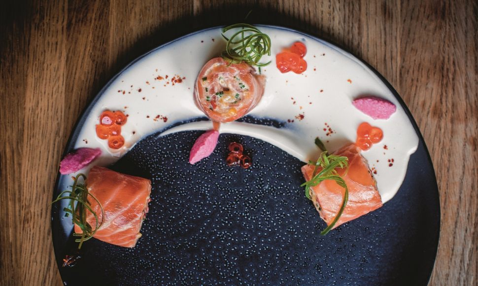 Beaucoup de fraîcheur et de tonicité pour ce saumon fumé farci au tarama, avec ses accents exotiques, sa crème citron et son condiment au raifort.