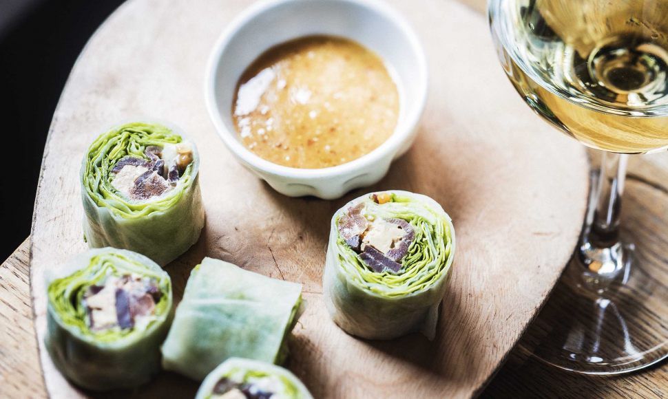 Quand l'Asie et les Landes ne font plus qu'un. Avec tous les ingrédients de l'incontournable salade landaise réunis, ici, dans une feuille de riz , à la manière d'un rouleau de printemps que l'on trempe dans une vinaigrette parfumée à l'ail et à l'armagnac.