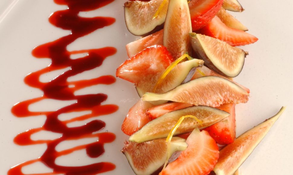 Sablé à la vanille, mélange de fraises et de figues, jus de sangria